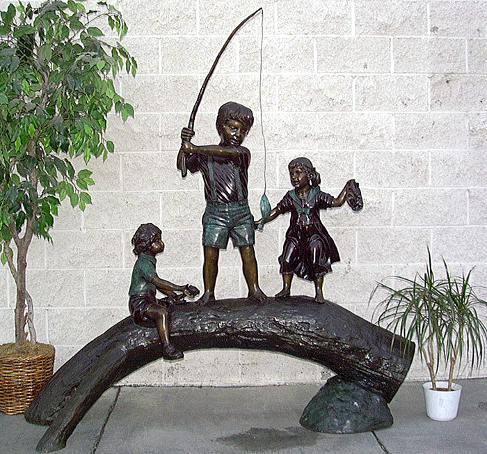 Discover the timeless charm of the Three Kids Fishing on Log bronze statue, a magnificent piece measuring 65 inches high, 72 inches long, and 30 inches deep. Created by esteemed artist Paul Anderson, this exquisite sculpture is meticulously handcrafted and cast using the traditional lost-wax casting method, ensuring exceptional quality and artistry that will be treasured for generations.