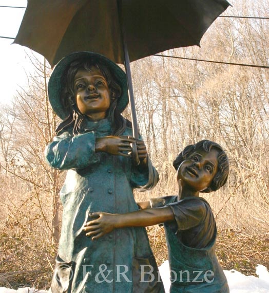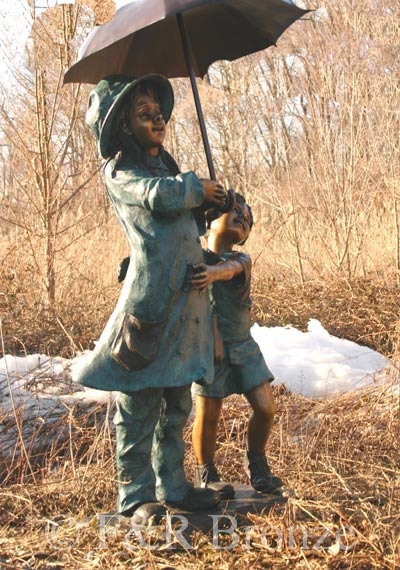 Girl & Boy Holding UmbrellaThis bronze statue measures 60”