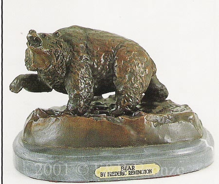 | BearThe Bear bronze statue, inspired by Frederic Remington, is handmade and cast in the traditional Lost Wax Casting Process. This insures a quality bronze sculpture that may be passed down from generation to generation. Inspired pieces by Remington were not done by Remington, but made by various artists inspired by paintings that Remington had done in his lifetime. Inspired pieces were made after Remington’s death.