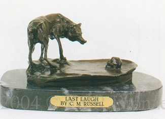 | Last Laugh Charles Marion Russell was a renowned artist of the American West, celebrated for his vivid paintings and bronze sculptures depicting cowboys, Native Americans, and frontier life. He often infused humor and storytelling into his work, capturing both the hardships and the lighter moments of Western life. The traditional Lost Wax Casting process, which Russell employed for his sculptures, involves creating a detailed wax model that is encased in a heat-resistant material to form a mold. When heated, the wax melts away ("lost"), leaving a cavity that is filled with molten bronze. This meticulous process results in high-quality sculptures that can be cherished for generations. While specific details about the bronze statue titled "Last Laugh" are limited, it aligns with Russell's style to incorporate humor into his art. This piece likely showcases his ability to blend artistry with storytelling, offering a glimpse into the more whimsical aspects of frontier life. For more detailed information about "Last Laugh," you might consider reaching out to art galleries that specialize in Western art or institutions that house Russell's works. Sizes: Regular - 5" H x 9" L - $450.00