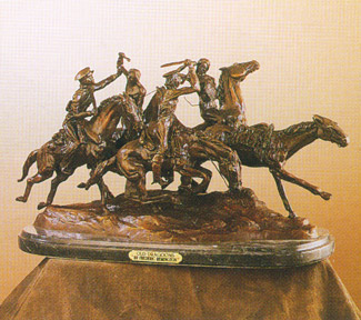 | Old DragoonsDiscover the distinguished elegance of Frederic Remington's "Old Dragoons" bronze statue, a magnificent representation of artistic mastery and historical significance. Crafted with meticulous attention to detail through the traditional lost wax casting process, this statue is not just a mere decorative piece but a testament to enduring craftsmanship. The artist-applied, hand-rubbed patina accentuates the intricate textures and dynamic contours, imbuing each figure with a lifelike presence. As an emblem of luxury and refined taste, "Old Dragoons" by Remington transcends mere aesthetics, infusing any home or office space with a sophisticated and cultured ambiance. Its timeless appeal and exquisite artistry make it an unparalleled addition to any collection, promising to elevate the atmosphere and impart a sense of opulent history to its surroundings.