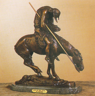 | This is one of the World's most famous Native American Icons. This piece is commonly mistaken as being done by Frederic Remington. This piece can be viewed in museums all over the world including the 21 ft high model at Cowboy Hall Of Fame in Okalahoma City, OK. The End of the Trail design has been the subject for thousands of products including T-shirts, paintings, decorative items, etc. making this the world’s most famous Native American symbol. |